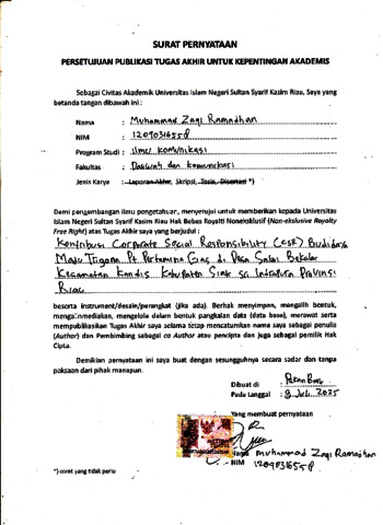 MUHAMMAD ZAQI RAMADHAN, - (2025) KONTRIBUSI CORPORATE SOCIAL RESPONSIBILITY (CSR) BUDIDAYA MADU TRIGONA PT PERTAMINA GAS DI DESA SAKAI BEKALAR KECAMATAN KANDIS KABUPATEN SIAK SRI INDRAPURA PROVINSI RIAU. Skripsi thesis, Universitas Islam Negeri Sultan Syarif Kasim Riau.