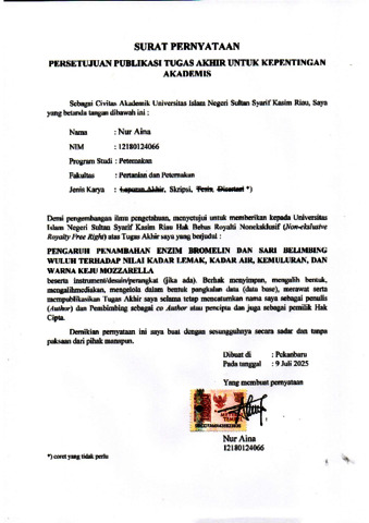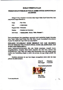 NUR AINA, - (2025) PENGARUH PENAMBAHAN ENZIM BROMELIN DAN SARI BELIMBING WULUH TERHADAP NILAI KADAR LEMAK, KADAR AIR, KEMULURAN DAN WARNA KEJU MOZZARELLA. Skripsi thesis, UNIVERSITAS ISLAM NEGERI SULTAN SYARIF KASIM RIAU.