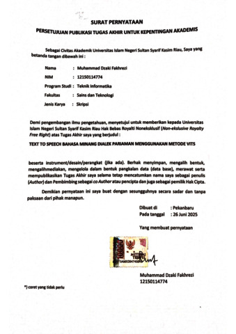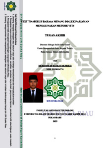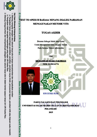 MUHAMMAD DZAKI FAKHREZI, - (2025) TEXT TO SPEECH BAHASA MINANG DIALEK PARIAMAN MENGGUNAKAN METODE VITS. Skripsi thesis, UIN SUSKA.