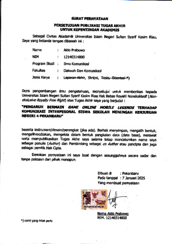 ALDO PRABOWO, - (2025) PENGARUH BERMAIN GAME ONLINE MOBILE LEGENDS TERHADAP KOMUNIKASI INTERPERSONAL SISWA SEKOLAH MENENGAH KEJURUAN NEGERI 4 Pekanbaru. Skripsi thesis, UNIVERSITAS ISLAM NEGERI SULTAN SYARIF KASIM.