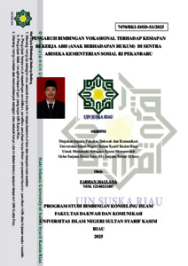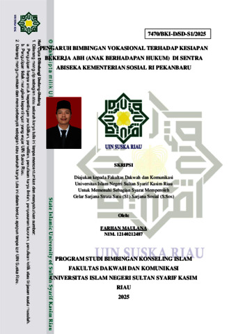 ABSTRAK Nama :Farhan Maulana NIM :12140212487 Prodi : Bimbingan Konseling Islam Judul :Pengaruh Bimbingan Vokasional terhadapn Kesiapan Bekerja ABH ( Anak Berhadapan Hukum ) di Sentra Abiseka Kementrian Sosial RI Pekanbaru Anak Berhadapan dengan Hukum (ABH) kerap mengalami kesulitan dalam Anak Berhadapan dengan Hukum (ABH) sering menghadapi berbagai tantangan dalam mempersiapkan diri memasuki dunia kerja, terutama karena keterbatasan keterampilan, kurangnya kepercayaan diri, serta minimnya akses terhadap pelatihan kerja. Penelitian ini bertujuan untuk mengetahui pengaruh bimbingan vokasional terhadap kesiapan bekerja ABH di Sentra Abiseka Kementerian Sosial RI Pekanbaru. Penelitian ini menggunakan metode kuantitatif dengan pendekatan deskriptif. Sampel penelitian berjumlah 22 orang ABH yang dipilih melalui teknik purposive sampling. Pengumpulan data dilakukan menggunakan instrumen kuesioner dan dianalisis dengan teknik regresi linear sederhana melalui bantuan program SPSS versi 27.0. Hasil penelitian menunjukkan bahwa bimbingan vokasional berpengaruh signifikan terhadap kesiapan bekerja ABH, dengan nilai signifikansi sebesar 0,000 (< 0,05) dan nilai koefisien determinasi (R²) sebesar 0,447. Artinya, bimbingan vokasional memberikan kontribusi sebesar 44,7% terhadap peningkatan kesiapan kerja ABH. Temuan ini menunjukkan bahwa program bimbingan vokasional memiliki peran penting dalam mendukung proses rehabilitasi sosial, pengembangan keterampilan kerja, serta meningkatkan peluang reintegrasi sosial ABH di masyarakat secara lebih mandiri dan produktif. Kata Kunci : Bimbingan Vokasional, Kesiapan Bekerja, Anak Berhadapan dengan Hukum.