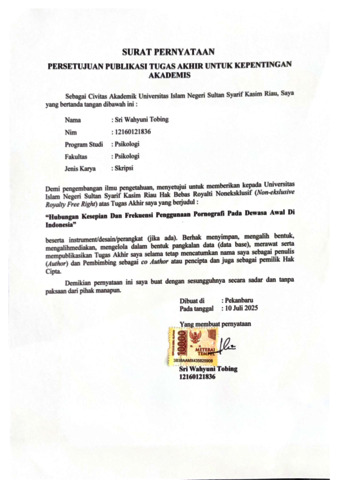 SRI WAHYUNI TOBING, - (2025) HUBUNGAN KESEPIAN DAN FREKUENSI PENGGUNAAN PORNOGRAFI PADA DEWASA AWAL DI INDONESIA. Skripsi thesis, UNIVERSITAS ISLAM NEGERI SULTAN SYARIF KASIM RIAU.