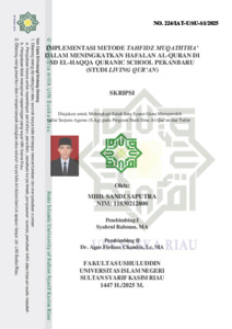 ABSTRAK Skripsi ini berjudul “Implementasi Metode Tahfidz Muqaththa’ Dalam Meningkatkan Hafalan Al-Quran Di SD El-Haqqa Quranic School Pekanbaru”. Penelitian ini bertujuan untuk mendeskripsikan dan menjelaskan implementasi metode tahfidz muqaththa‘ dalam meningkatkan kemampuan hafalan al-Qur‟an siswa di SD El-Haqqa Qur‟anic School Pekanbaru. Metode tahfidz muqaththa‘ merupakan metode menghafal al-Qur‟an dengan menggunakan mushaf yang dipotong ayatnya menjadi penggalan-penggalan yang hanya tersisa ayat yang terletak di awal dan di akhir ayat saja pada setiap barisnya, yang di namakan dengan mushaf muqaththa‘ sekaligus dijadikan sebagai nama sebuah metode tahfidz. Penelitian ini menggunakan metode campuran dengan pendekatan deskriptif kualitatif, dengan dukungan data kuantitatif dari hasil pre-test dan post- test hafalan siswa. Pengumpulan data dilakukan melalui observasi, wawancara mendalam, dokumentasi, dan tes uji hafalan dengan tes pre-test dan post-test pada 11 orang siswa. Hasil penelitian menunjukkan bahwa implementasi metode ini dilakukan dengan merujuk kepada empat standar mutqin: mutqin bin nazhar, mutqin bil muqaththa‘, mutqin bil ghaib, dan mutqin bil kitabah, namun pada mutqin bil kitabah belum diimplementasikan karena keterbatasan terhadap kemampuan siswa di tingkat sekolah dasar. Metode ini memudahkan siswa dalam menghafal dengan membagi ayat menjadi bagian-bagian kecil yang bermakna, sehingga memperkuat daya ingat dan recall hafalan. Didukung dari hasil data hasil pre-test dan post-test menunjukkan bahwa seluruh siswa mengalami peningkatan kemampuan hafalan secara signifikan terhadap kemampuan hafalan siswa baik secara teknis, kognitif, maupun afektif. Selain itu, metode ini juga berdampak pada peningkatan motivasi, rasa percaya diri, dan kedisiplinan siswa dalam menghafal. Berdasarkan temuan ini, metode tahfidz muqaththa‘ terbukti efektif dalam mendukung proses pembelajaran tahfidz al-Qur‟an, terutama pada tingkat sekolah dasar. Namun, terdapat kekurangan pada metode ini yaitu mushaf yang diterapkan terbatas pada mushaf Madinah saja dan belum tersedia dalam format mushaf standar nasional, kemudian metode ini juga kurang cocok diterapkan untuk anak-anak usia dini. Kata kunci: Metode, Tahfidz Muqaththa‘, SD El-Haqqa Quranic School