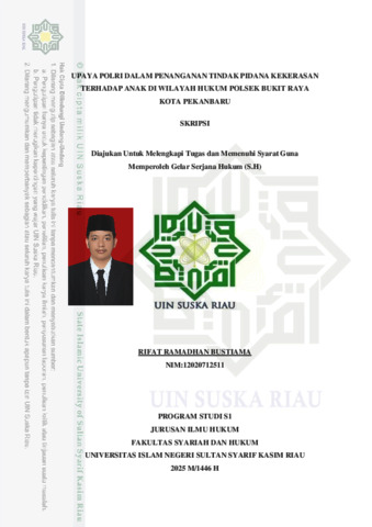 ABSTRAK Rifat Ramadhan Bustiama, (2024): Upaya Polri dalam Penanganan Tindak Pidana Kekerasan Terhadap Anak di Wilayah Hukum Polsek Bukit Raya Kota Pekanbaru Penelitian ini di latarbelakangi dengan adanya Tindak Pidana Kekerasan Terhadap Anak Di Wilayah Hukum Polsek Bukit Raya Kota Pekanbaru yang mengacuh pada Undang-undang Nomor 35 Tahun 2014 Tentang Perlindungan Anak bahwa masih banyak kasus kekerasan terhadap anak di wilayah hukum Polsek Bukit Raya Kota Pekanbaru yang mengalami peningkatan setiap tahunnya, Adapun rumusan masalah dalam penelitian ini yaitu bagaimana Upaya Polri dalam menangani tindak pidana kekerasan terhadap anak di wilayah hukum Polsek Bukit Raya dan apa saja faktor penghambat dalam menangani tindak pidana kekerasan terhadap anak di wilayah hukum Polsek Bukit Raya. Penelitian ini merupakan penelitian hukum empiris, dimana penulis secara langsung turun kelapangan untuk melakukan observasi dan mencari data yang diperlukan untuk penelitian ini. Dengan menggunakan pendekatan deskriptif kualitatif, maka digunakan data primer yaitu polsek Bukit Raya, pelaku, korban, dan tokoh masyarakat, sumber data sekunder adalah buku, jurnal, skripsi dan internet, sedangkan sumber data tersier yaitu dari Kamus Besar Bahasa Indonesia (KBBI). Hasil penelitian ini menyimpulkan bahwa di Polsek Bukit Raya, upaya Polri dalam menangani kekerasan terhadap anak melibatkan dua pendekatan utama, yakni refresif dan preventif. Secara refresif, polisi bertindak sebagai penegak hukum dengan melakukan penyelidikan, penangkapan, dan penuntutan terhadap pelaku, sementara langkah preventif meliputi penyuluhan, edukasi masyarakat, dan patroli untuk mencegah kekerasan. Polsek Bukit Raya juga menggunakan jalur pengadilan dan luar pengadilan dalam penanggulangan kejahatan, dengan pemidanaan berdasarkan undang-undang perlindungan anak. Namun, faktor penghambat seperti kurangnya pemahaman masyarakat tentang perlindungan anak, keterbatasan sumber daya, rendahnya tingkat pendidikan dan kesadaran, serta kurangnya kerjasama antar instansi menjadi tantangan dalam mewujudkan perlindungan anak yang lebih efektif di wilayah tersebut. Kata Kunci : Penanganan, Tindak Pidana Kekerasan, Terhadap Anak