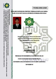 ABSTRAK Nama : M Fadhli Luthfi NIM : 12140212684 Judul : Pengaruh Konseling Individu Terhadap kepuasan Kerja Karyawan di PT Elnusa Petrofin Intergrated Dumai Penelitian ini bertujuan untuk mengetahui pengaruh konseling individu terhadap kepuasan kerja karyawan di PT Elnusa Petrofin Integrated Dumai. Berdasarkan hasil analisis kuantitatif terhadap 63 responden, ditemukan bahwa konseling individu berpengaruh sangat signifikan dan kuat terhadap kepuasan kerja, dengan nilai signifikansi 0.000 dan koefisien korelasi Pearson sebesar 0.899. Konseling terbukti efektif dalam mengatasi tekanan kerja dan meningkatkan kenyamanan psikologis karyawan. Saran penelitian mencakup pentingnya penyediaan layanan konseling yang berkelanjutan dan profesional. Untuk penelitian selanjutnya, disarankan agar menambahkan variabel lain seperti stres kerja, kepemimpinan, atau budaya organisasi, serta menggunakan pendekatan metode campuran guna memperoleh pemahaman yang lebih komprehensif mengenai faktor-faktor yang memengaruhi kepuasan kerja. Kata Kunci : Konseling Individu, Kepuasan Kerja, Karyawan.