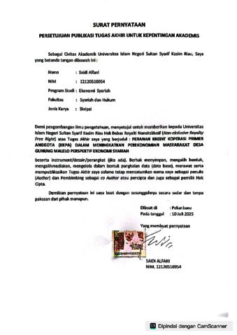SAIDI ALFANI, - (2025) PERANAN KREDIT KOPERASI PRIMER ANGGOTA (KKPA) DALAM MENINGKATKAN PEREKONOMIAN MASYARAKAT DESA GUNUNG MALELO PERSPEKTIF EKONOMI SYARIAH. Skripsi thesis, UNIVERSITAS ISLAM NEGERI SULTAN SYARIF KASIM RIAU.