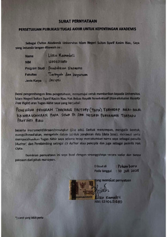Lista Ramadeli :Pengaruh Program Teaching Factory (TEFA) Terhadap Nilai-nilai Kewirausahaan Pada Siswa Di SMK Negeri Pertanian Terpadu Provinsi Riau Penelitian ini bertujuan untuk mengetahui besarnya pengaruh Program Teaching Factory (TEFA) Terhadap Nilai-nilai Kewirausahaan Pada Siswa Di SMK Negeri Pertanian Terpadu Provinsi Riau. Penelitian ini menggunakan pendekatan kuantitatif. Subjek dalam penelitian ini Siswa Jurusan APHP Kelas XI SMK Negeri Pertanian Terpadu Provinsi riau sebanyak 96 Siswa. Teknik pengambilan sampel dengan menggunakan Purposive sampling. Teknik pengumpulan data menggunakan angket dan dokumentasi. Teknik analisis data menggunakan regresi linier sederhana. Berdasarkan hasil penelitian tentang Pengaruh Program Teaching Factory (TEFA) Terhadap Nilai-nilai Kewirausahaan Pada Siswa Di SMK Negeri Pertanian Terpadu Provinsi Riau, hasil perhitungan uji korelasi diperoleh nilai r (Pearson Correlation) dari korelasi Program Teaching Factory (TEFA) Terhadap Nilai-nilai Kewirausahaan adalah sebesar 0, 627 atau r hitung>r tabel (0,627> 0,203) dengan tingkat probabilitas 0,000. Oleh karena probabilitas lebih kecil dari 0.05, maka Ho ditolak Ha diterima, artinya terdapat pengaruh Program Teaching Factory (TEFA) Terhadap Nilai-nilai Kewirausahaan Dilihat dari R Square menunjukkan bahwa persentase sumbangan pengaruh variabel X terhadap variabel Y sebesar 39,3% dengan kategori Cukup atau variasi variabel Program Teaching Factory (TEFA) Terhadap Nilai-nilai Kewirausahaan mampu menjelaskan sebesar 39,3% sedangkan sisanya 60,7% dipengaruhi atau dijelaskan oleh variabel lain. Kata Kunci : Program Teaching Factory, Nilai-nilai Kewirausahaan, Siswa.