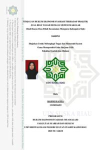 ABSTRAK Rahmi Hafiza (2025) : Tinjauan Hukum Ekonomi Syariah Terhadap Praktik Jual Beli Tanah Dengan Sistem Makelar (Studi Kasus Desa Paluh Kecamatan Mempura Kabupaten Siak) Penelitian ini di latar belakangi oleh praktik penjualan tanah yang menggunakan jasa seorang makelar di Desa Paluh Kecamatan Mempura Kabupaten Siak. Dimana jika masyarakat desa Paluh terdesak kebutuhan hidup, maka salah satu jalan yang bisa diambil adalah dengan menjual tanah milik mereka melalui perantara seorang makelar, serta pengurusan dokumen penting seperti balik nama dan sertifikat tanah. Namun pada praktiknya makelar kerap mengingkari kesepakatan awal dan melimpahkan tanggung jawab pengurusan dokumen kepada pemilik tanah, sehingga pemilik tanah merasa dirugikan. Rumusan masalah dalam penelitian ini adalah bagaimana praktik jual beli tanah dengan sistem makelar di Desa Paluh Kecamatan Mempura Kabupaten Siak, kemudian bagaimana tinjauan hukum ekonomi syariah terhadap praktik jual beli tanah dengan sistem makelar di Desa Paluh Kecamatan Mempura Kabupaten Siak. Tujuan penelitian ini adalah untuk menjelaskan bagaimana tinjauan hukum ekonomi syariah terhadap praktik jual beli tanah dengan sistem makelar di Desa Paluh Kecamatan Mempura Kabupaten Siak. Penelitian ini menggunakan metode kualitatif lapangan dengan teknik observasi, wawancara, dan dokumentasi terhadap satu orang makelar dan lima pemilik tanah. Analisis data dilakukan secara deskriptif kualitatif. Selain data lapangan, penelitian ini juga didukung oleh studi kepustakaan dari buku, hasil penelitian, dan sumber daring terkait praktik jual beli dan peran makelar tanah. Hasil penelitian menunjukkan bahwa makelar yang awalnya berjanji mengurus seluruh administrasi justru membebankan tanggung jawab tersebut kepada pemilik tanah. Dalam tinjauan fiqih muamalah, jual beli melalui makelar diperbolehkan selama tidak mengandung tadlis (penipuan) dan gharar (ketidak jelasan). Namun, tindakan makelar dalam kasus ini melanggar prinsip syariah karena menyalahi akad dan merugikan pihak lain, sehingga akad jual beli dinilai tidak sah menurut hukum Islam. Kata Kunci : Hukum ekonomi syariah, jual beli tanah, makelar, tadlīs, akad, Desa Paluh.