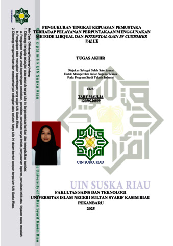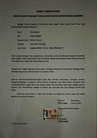 TARY MAULIA, - (2025) PENGUKURAN TINGKAT KEPUASAN PEMUSTAKA TERHADAP PELAYANAN PERPUSTAKAAN MENGGUNAKAN METODE LIBQUAL DAN POTENTIAL GAIN IN CUSTOMER VALUE. Skripsi thesis, UNIVERSITAS ISLAM NEGERI SULTAN SYARIF KASIM RIAU.