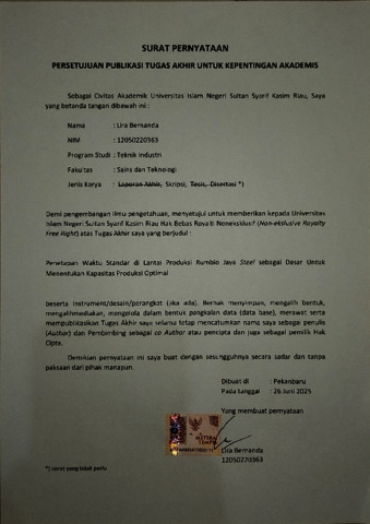 LIRA BERNANDA, - (2025) PENETAPAN WAKTU STANDAR DI LANTAI PRODUKSI RUMBIO JAYA STEEL SEBAGAI DASAR UNTUK MENENTUKAN KAPASITAS PRODUKSI OPTIMAL. Skripsi thesis, UNIVERSITAS ISLAM NEGERI SULTAN SYARIF KASIM RIAU.
