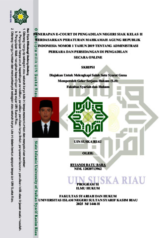 Penerapan E-Court Di Pengadilan Negeri Siak Kelas II Berdasarkan Peraturan Mahkamah Agung Republik Indonesia Nomor 1 Tahun 2019 Tentang Administrasi Perkara Dan Persidangan Di Pengadilan Secara Online Penelitian ini untuk mengetahui E-Court dan hambatan pelaksanaan ECourt atau pendaftaran online di Pengadilan Negeri Siak Kelas II berdasarkan Undang-Undang Nomor 1 Tahun 2019. Perihal tersebut dikarenakan masih adanya gangguan server saat advokat atau pihak yang mengajukan gugatan ke Pengadilan Negeri Siak Kelas II mendaftarkan E-Court dan masih terdapat juga adanya pihak individu yang tidak mengetahui tata cara perkara secara E-Court. Jenis penelitian ini adalah Hukum Empiris, dengan pendekatan implementasi hukum yang bersifat deskriptif. Penelitian langsung ke lapangan yang berlokasi di Pengadilan Negeri Siak Kelas II, informan penelitian terdiri dari 6 informan key dengan 2 informan yang diambil dari pihak Pengadilan Negeri Siak Kelas II. Sumber data yang digunakan adalah data primer dan data sekunder. Teknik pengumpulan data penelitian ini observasi, wawancara,studi pustaka. Analisis data penelitian ini adalah analisis data kualitatif. Hasil dari penelitian ini adalah penerapan E-Court berdasarkan Peraturan Mahkamah Agung Nomor 1 Tahun 2019 menciptakan efektivitas proses beracara di Pengadilan. Untuk penerapan E-Court di Pengadilan Negeri Siak Kelas II sudah diterapkan sejak tahun 2019. Dimana penerapa E-Court di Pengadilan Negeri Siak Kelas II sudah memenuhi asas sederhana, asas cepat dan asas biaya ringan. Namun Pengadilan Negeri Siak Kelas II dalam penerapan E-Court yang tergolong masih baru dan belum sepenuhnya efektif dikarenakan masih ada kekurangan dalam pengimplementasianya kepada masyarakat, dimana masyarakat masih ada yang tidak mengerti hingga tidak mau menggunakan E-Court dan memilih sistem konvensional. Aldalpun kendallal yalng dihaldalpi oleh Pengadilan Negeri Siak Kelas II tersebut dialntalralnyal kendala server Mahkamah Agung dan faktor kurangnya pengetahuan para pihak. Kata Kunci : Penerapan, E-Court, Pengadilan Negeri