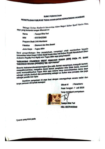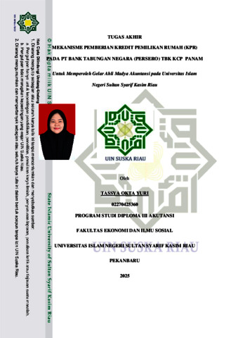 TASSYA OKTA YURI (2025) MEKANISME PEMBERIAN KREDIT PEMILIKAN RUMAH (KPR) PADA PT BANK TABUNGAN NEGARA (PERSERO) TBK KCP PANAM. Laporan thesis, UNIVERSITAS ISLAM NEGERI SULTAN SYARIF KASIM RIAU.