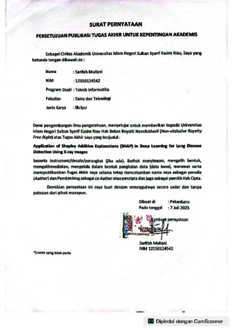SARIFAH MULIANI, - (2025) APPLICATION OF SHAPLEY ADDITIVE EXPLANATIONS (SHAP) IN DEEP LEARNING FOR LUNG DISEASE DETECTION USING X-RAY IMAGES. Journal of Artificial Intelligence and Software Engineering (JAISE), 5 (2). pp. 709-719. ISSN E-ISSN: 2777-001X, DOI: 10.30811/jaise.v5i2.7005