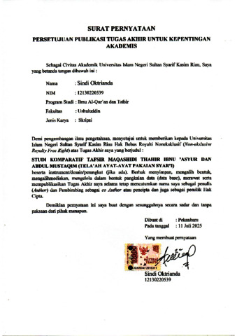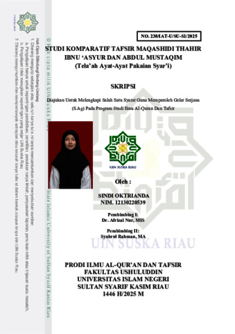 SINDI OKTRIANDA, - (2025) STUDI KOMPARATIF TAFSIR MAQASHIDI THAHIR IBNU ‘ASYUR DAN ABDUL MUSTAQIM (Tela’ah Ayat-Ayat Pakaian Syar’i). Skripsi thesis, Universitas Islam Negeri Sultan Syarif Kasim Riau.