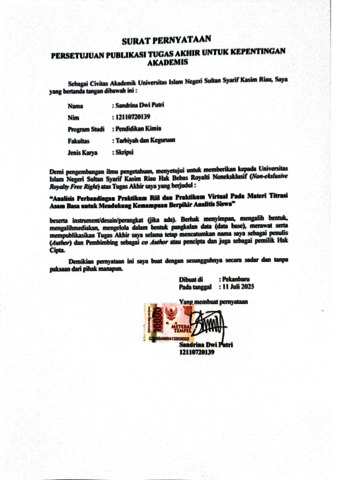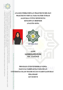 SANDRINA DWI PUTRI (2025) ANALISIS PERBANDINGAN PRAKTIKUM RIIL DAN PRAKTIKUM VIRTUAL PADA MATERI TITRASI ASAM BASA UNTUK MENDUKUNG KEMAMPUAN BERPIKIR ANALITIS SISWA. Skripsi thesis, UNIVERSITAS ISLAM NEGERI SULTAN SYARIF KASIM RIAU.