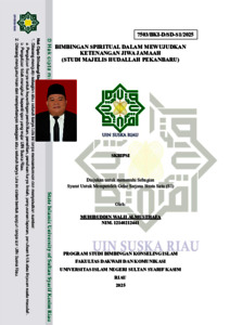 ABSTRAK Nama : Muhibuddin Walii Almusthafa Nim : 12140212441 Judul : Bimbingan Spiritual Dalam Mewujudkan Ketenangan Jiwa Jamaah (Studi Majelis Hudallah Pekanbaru ). Penelitian ini bertujuan untuk mengetahui peran bimbingan spiritual dalam mewujudkan ketenangan jiwa jamaah di Majelis Hudallah Pekanbaru. Latar belakang penelitian ini didasari oleh fenomena kegelisahan, kekosongan jiwa, dan meningkatnya gangguan mental di masyarakat, yang menunjukkan pentingnya pendekatan spiritual dalam mengatasi krisis batin. Penelitian ini menggunakan metode kualitatif dengan pendekatan deskriptif. Teknik pengumpulan data dilakukan melalui observasi, wawancara mendalam, dan dokumentasi terhadap pimpinan dan jamaah Majelis Hudallah sebagai informan.Hasil penelitian menunjukkan bahwa bimbingan spiritual yang dilaksanakan secara rutin dalam bentuk kajian tasawuf, dzikir, pembacaan maulid, dan shalawat memberikan dampak signifikan terhadap ketenangan jiwa jamaah. Para jamaah merasakan perubahan positif, seperti meningkatnya kedamaian batin, arah hidup yang lebih jelas, serta kemampuan mengelola emosi dan masalah hidup dengan lebih bijak. Bimbingan spiritual juga memperkuat hubungan vertikal antara individu dengan Allah dan horizontal dengan sesama manusia. Faktor pendukung keberhasilan bimbingan ini antara lain adalah keberadaan pembimbing spiritual yang berkompeten dan komunitas yang suportif. Adapun tantangan yang dihadapi meliputi kemalasan, inkonsistensi praktik ibadah, serta godaan duniawi yang mengganggu proses pembinaan spiritual.Dengan demikian, bimbingan spiritual terbukti berkontribusi secara signifikan dalam membentuk ketenangan jiwa jamaah, serta menjadi salah satu pendekatan efektif dalam konseling Islam untuk membina kesehatan mental dan spiritual umat. Kata Kunci: Bimbingan spiritual, ketenangan jiwa, jamaah, Majelis Hudallah, konseling Islam.