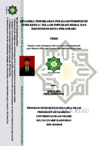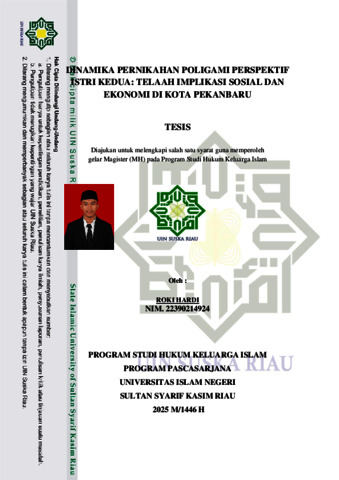 ABSTRAK Roki Hardi, (2025) : Dinamika Pernikahan Poligami Perspektif Istri Kedua: Telaah Implikasi Sosial Dan Ekonomi Di Kota Pekanbaru Praktik poligami, meskipun dibolehkan dalam Islam dengan syarat utama keadilan, masih menimbulkan kontroversi sosial dan tantangan hukum, khususnya bagi istri kedua. Di Kota Pekanbaru, fenomena poligami kerap dilakukan secara diam-diam dan tanpa pencatatan resmi, yang berimplikasi pada kerentanan hakhak istri kedua dalam aspek sosial, ekonomi, dan hukum. Penelitian ini bertujuan untuk mengidentifikasi serta menganalisis hak-hak yang seharusnya diperoleh oleh istri kedua dalam praktik poligami dan tantangan yang mereka hadapi dalam realitas sosial masyarakat Pekanbaru. Penelitian ini menggunakan pendekatan kualitatif dengan metode studi kasus. Data diperoleh melalui wawancara mendalam dengan istri kedua dari tiga rumah tangga poligami di Kecamatan Marpoyan Damai, serta wawancara pendukung dari suami, tokoh agama, aktivis perempuan, dan ahli hukum keluarga. Teknik pengumpulan data dilakukan melalui observasi partisipatif, dokumentasi, dan triangulasi narasumber untuk menjamin validitas data. Hasil penelitian menunjukkan bahwa hak-hak normatif istri kedua seperti nafkah lahir dan batin, tempat tinggal layak, perlakuan adil, serta pengakuan hukum seringkali tidak terpenuhi. Di sisi lain, istri kedua juga menghadapi tantangan berupa stigma sosial, ketidaksetaraan ekonomi, keterbatasan pengakuan hukum, dan ketidakjelasan nasib anak akibat pernikahan yang tidak tercatat. Namun demikian, ditemukan pula potensi kemandirian ekonomi di kalangan istri kedua sebagai bentuk adaptasi dan pemberdayaan. Penelitian ini merekomendasikan perlunya regulasi dan perlindungan hukum yang lebih tegas untuk menjamin keadilan dalam praktik poligami. Kata kunci: Dinamika, Poligami, Istri Kedua, Kota Pekanbaru.