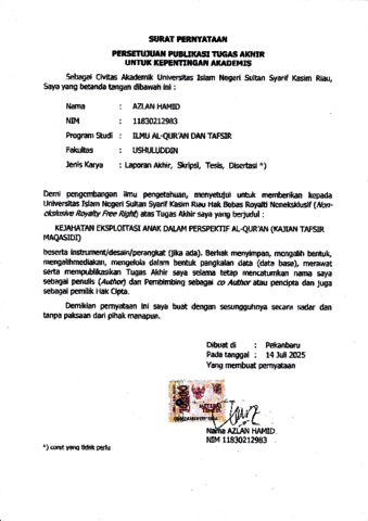 AZLAN HAMID, - (2025) KEJAHATAN EKSPLOITASI ANAK DALAM PERSPEKTIF AL-QUR'AN (KAJIAN TAFSIR MAQASIDI). Skripsi thesis, Universitas Islam Negeri Sultan Syarif Kasim Riau.