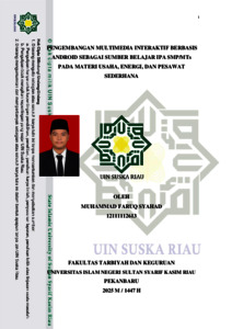 ABSTRAK Muhammad Faruq Syahad (2025): Pengembangan Multimedia Interaktif Berbasis Android sebagai Sumber Belajar IPA SMP/Mts pada Materi Usaha, Energi, dan Pesawat Sederhana Penelitian ini bertujuan untuk menghasilkan multimedia interaktif berbasis Android sebagai sumber belajar IPA SMP/MTs pada materi usaha, energi, dan pesawat sederhana. Penelitian ini menggunakan metode Research and Development dengan model pengembangan ADDIE dengan 5 tahapan yaitu 1) analysis, 2) design, 3) development, 4) implementation, 5) evaluation. Teknik analisis data berupa data kualitatif dan data kuantitatif dengan menggunakan angket validitas, praktikalitas, dan respon peserta didik. Hasil validitas dari ahli materi 78%, ahli media 72,4%, ahli bahasa 90%, dengan nilai rata rata keseluruhan 80,13%. Berdasarkan hasil ini, e-modul yang dikembangkan dinyatakan Valid. Multimedia juga dinyatakan Sangat Praktis dengan penilaian praktikalitas oleh guru mencapai 91,40%. Sementara itu, respon peserta didik menunjukkan hasil yang Sangat Baik dengan nilai 85,46%. Dari hasil tersebut, dapat disimpulkan bahwa multimedia interaktif berbasis Android sebagai sumber belajar IPA SMP/MTs pada materi usaha, energi, dan pesawat sederhana yang dikembangkan valid, sangat praktis, dan mendapatkan respon yang sangat baik dari peserta didik. Kata Kunci: Multimedia, Android, Sumber Belajar IPA