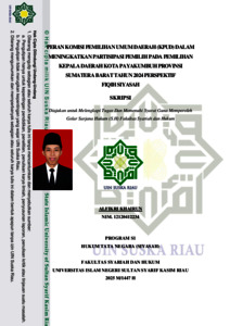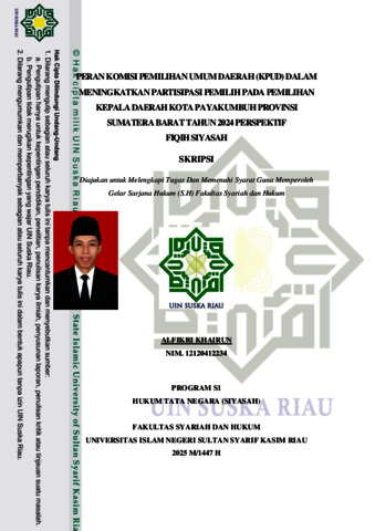 Alfikri Khairun, (2025): Peran Komisi Pemilihan Umum Daerah (KPUD) Dalam Meningkatkan Partisipasi Pemilih Pada Pemilihan Kepala Daerah Kota Payakumbuh Provinsi Sumatera Barat Tahun 2024 Perspektif Fiqih Siyasah Penulisan skripsi ini dilatarbelakangi oleh rendahnya partisipasi pemilih pada pilkada Kota Payakumbuh tahun 2024. Permasalahan dalam penelitian ini adalah bagaimana peran KPUD dalam meningkatkan partisipasi pemilih pada pemilihan kepala daerah Kota Payakumbuh tahun 2024, lalu apa saja kendala KPUD dalam meningkatkan partisipasi pemilih pada pemilihan kepala daerah Kota Payakumbuh tahun 2024, dan bagaimana tinjauan fiqih siyasah terhadap peran KPUD Kota Payakumbuh dalam meningkatkan partisipasi pemilih. Penelitian ini adalah penelitian lapangan(field research) dengan metode kualitatif, dengan teknik pengumpulan data yang digunakan adalah wawancara dan dokumentasi. Teknik analisis data yaitu menampilkan data(data display), reduksi data(data reduction), penarikan kesimpulan dan verifikasi(conclusion drawing/verification). Hasil dari penelitian ini adalah KPUD Kota Payakumbuh sudah berperan maksimal dalam meningkatkan partisipasi pemilih, berupa melakukan sosialisasi, pendidikan pemilih, melakukan kerja sama dengan berbagai pihak, dan memberikan akses informasi kepada masyarakat. Lalu adanya kendala dalam meningkatkan partisipasi pemilih yaitu karena terjadinya kejenuhan masyarakat terhadap politik, dan yang terakhir yaitu peran KPUD dalam meningkatkan partisipasi pemilih sudah sesuai dengan fiqih siyasah karena mengajak kepada memilih seorang pemimpin untuk menjaga kemaslahatan umat dan mengajak kepada perbuatan amar makruf. Kata Kunci: Demokrasi, Peran KPU, Partisipasi Pemilih, Siyasah