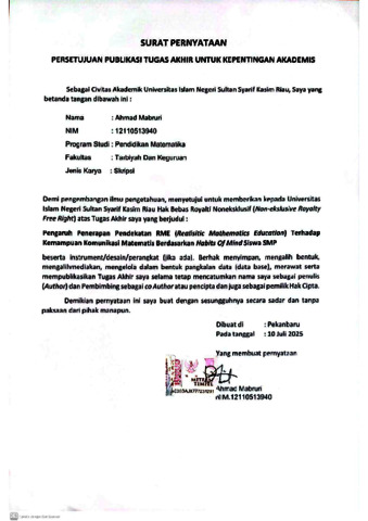 AHMAD MABRURI, - (2025) PENGARUH PENERAPAN PENDEKATAN RME (REALISTIC MATHEMATICS EDUCATION) TERHADAP KEMAMPUAN KOMUNIKASI MATEMATIS BERDASARKAN HABITS OF MIND SISWA SMP. Skripsi thesis, UNIVERSITAS ISLAM NEGERI SULTAN SYARIF KASIM RIAU.