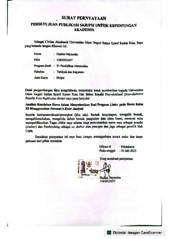 FHATINA HAYANNISA, - (2025) ANALISIS KESALAHAN SISWA DALAM MENYELESAIKAN SOAL PROGRAM LINIER PADA SISWA KELAS XI MENGGUNAKAN NEWMAN’S ERROR ANALYSIS. Skripsi thesis, UIN SUSKA.