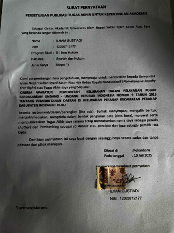 ILHAM GUSTIADI, - (2025) KINERJA APARATUR PEMERINTAH KELURAHAN DALAM PELAYANAN PUBLIK BERDASARKAN UNDANG - UNDANG REPUBLIK INDONESIA NOMOR 9 TAHUN 2015 TENTANG PEMERINTAHAN DAERAH DI KELURAHAN PERANAP KECAMATAN PERANAP KABUPATEN INDRAGIRI HULU. Skripsi thesis, UNIVERSITAS ISLAM NEGERI SULTAN SYARIF KASIM RIAU.