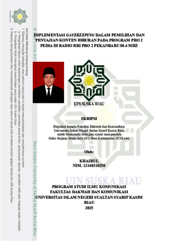 KHAIRUL, - (2025) IMPLEMENTASI GATEKEEPING DALAM PEMILIHAN DAN PENYAJIAN KONTEN HIBURAN PADA PROGRAM PRO 2 PEDIA DI RADIO RRI PRO 2 PEKANBARU 88.4 MHZ. Skripsi thesis, UNIVERSITAS ISLAM NEGERI SULTAN SYARIF KASIM RIAU.