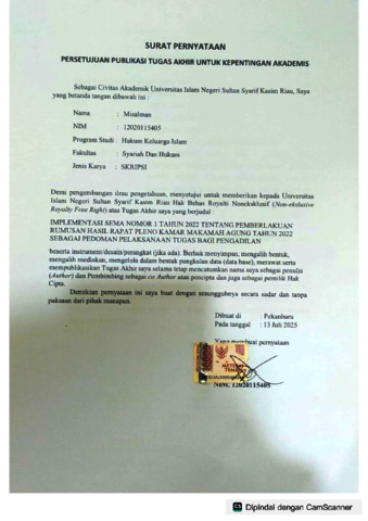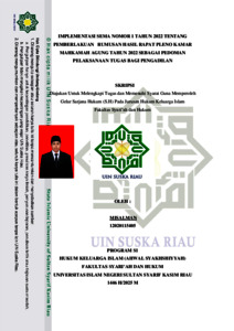 MISALMAN, - (2025) IMPLEMENTASI SEMA NOMOR 1 TAHUN 2022 TENTANG PEMBERLAKUAN RUMUSAN HASIL RAPAT PLENO KAMAR MAHKAMAH AGUNG TAHUN 2022 SEBAGAI PEDOMAN PELAKSANAAN TUGAS BAGI PENGADILAN. Skripsi thesis, UNIVERSITAS ISLAM NEGERI SULTAN SYARIF KASIM RIAU.