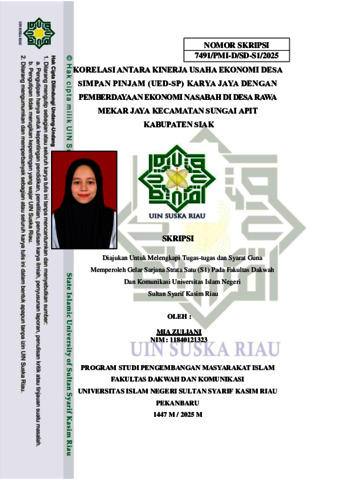 MIA ZULIANI, - (2025) KORELASI ANTARA KINERJA USAHA EKONOMI DESA SIMPAN PINJAM (UED-SP) KARYA JAYA DENGAN PEMBERDAYAAN EKONOMI NASABAH DI DESA RAWA MEKAR JAYA KECAMATAN SUNGAI APIT KABUPATEN SIAK. Skripsi thesis, UNIVERSITAS ISLAM NEGERI SULTAN SYARIF KASIM RIAU.