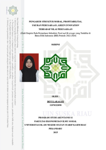 ABSTRAK PENGARUH STRUKTUR MODAL, PROFITABILITAS, UKURAN PERUSAHAAN, GREEN INNOVATION TERHADAP NILAI PERUSAHAAN OLEH : DEVI LARASATI NIM. 11870322098 Penelitian ini bertujuan untuk menguji pengaruh struktur modal, profitabilitas, ukuran perusahaan, dan Green Innovation terhadap nilai perusahaan pada subsektor food and beverages yang terdaftar di Bursa Efek Indonesia (BEI) selama periode 2022–2024. Nilai perusahaan dalam penelitian ini diproksikan dengan rasio Price to Book Value (PBV) sebagai indikator utama. Latar belakang penelitian didasarkan pada kondisi subsektor makanan dan minuman yang menunjukkan nilai PBV relatif rendah dibanding subsektor lain, serta pentingnya inovasi hijau dalam merespons perubahan perilaku konsumen dan tuntutan keberlanjutan. Metode yang digunakan adalah pendekatan kuantitatif dengan data sekunder yang diperoleh dari laporan keuangan tahunan perusahaan dan situs resmi Bursa Efek Indonesia. Teknik analisis data menggunakan regresi linier berganda. Hasil penelitian menunjukkan bahwa secara parsial struktur modal dan Green Innovation tidak berpengaruh signifikan terhadap nilai perusahaan. Sementara itu, profitabilitas dan ukuran perusahaan berpengaruh positif dan signifikan terhadap nilai perusahaan. Temuan ini memberikan implikasi penting bagi manajemen perusahaan dalam menyusun strategi keuangan dan inovasi berkelanjutan guna meningkatkan daya tarik investor dan nilai perusahaan di pasar modal. Kata Kunci: Struktur Modal, Profitabilitas, Ukuran Perusahaan, Green Innovation, Nilai Perusahaan, Food and Beverages