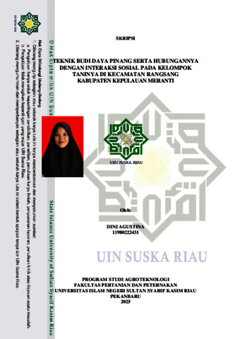 Teknik Budi Daya Pinang Serta Hubungannya Dengan Interaksi Sosial Pada Kelompok Taninya Di Kecamatan Rangsang Kabupaten Kepulauan Meranti Dini agustina (11980222431) Di bawah bimbingan Elfi Rahmadani dan Irwan Taslapratama INTISARI Pinang merupakan tanaman palem yang banyak dibudi dayakan di beberapa dearah di Indonesia salah satunya di Provinsi Riau. Salah satu upaya peningkatan produktivitas usaha tani adalah penerapan teknik budi daya yang tepat dan benar serta interaksi sosial yang baik dalam kelompok tani. Tujuan penelitian adalah mengetahui penerapan teknik budi daya petani pinang di Desa repan, Kecamatan rangsang, Kabupaten Kepulauan Meranti, menganalisis interaksi sosial dalam kelompok petani pinang di Desa Repan, Kecamatan Rangsang, Kabupaten Kepulaun Meranti pada aspek komunikasi, norma sosial, dan kerja sama, mengetahui korelasi antara penerapan teknik budi daya dan interaksi sosial bagi kelompok petani pinang. Penelitian ini dilaksanakan di Desa Repan selama 1 bulan (November-desember 2024). Penelitian ini dianalisis dengan metode kuantitatif deskriptif. Populasi penelitian berjumlah 40 orang, pengambilan sampel dilakukan secara sensus. Hasil penelitian menunjukkan bahwa penerapan teknik budi daya pinang yang di lakukan oleh kelompok tani Usaha Bersama dan Mekar Jaya tergolong kategori buruk dengan nilai rata-rata 37,85%. Hal ini disebabkan banyak anggota tani yang belum menerapkan teknik budi daya sesuai prosedur standar operasional yang diterapkan Kementerian pertanian, interaksi dalam kelompok tani Usaha Bersama dan Mekar Jaya pada aspek komunikasi, norma sosial, kerja sama rata-rata memiliki nilai cukup baik (persentase berturut-turut 42,16%, 45,87%, dan 46,25%), terdapat korelasi positif dan signifikan antar teknik budi daya terhadap interaksi sosial kelompok tani Usaha Bersama dan mekar Jaya. Kata kunci: produktivitas, sensus,usaha tani.
