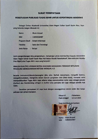 ILHAM ARSYAD, - (2025) ANALISA KUALITAS LAYANAN SISTEM AKADEMIK MAHASISWA TERHADAP KEPUASAN PENGGUNA MENGGUNAKAN METODE WEBQUAL 4.0. JOISIE (Journal of Information And Informatics Engineering), 9 (1). pp. 228-236. ISSN ISSN: 2503-5304