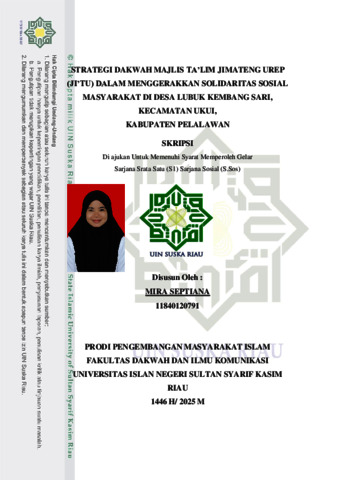 MIRA SEPTIANA, - (2025) STRATEGI DAKWAH MAJLIS TA'LIM JIMATENG UREP (JI'TU) DALAM MENGGERAKKAN SOLIDARITAS SOSIAL MASYARAKAT DI DESA LUBUK KEMBANG SARI, KECAMATAN UKUI, KABUPATEN PELALAWAN. Skripsi thesis, UNIVERSITAS ISLAM NEGERI SULTAN SYARIF KASIM RIAU.