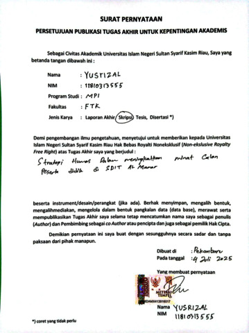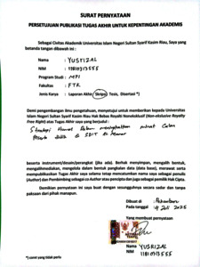 SURAT PERNYATAAN PUBLIKASI YUSRIZAL - Yus Rizal.pdf - Published Version Download (142kB) | Preview |