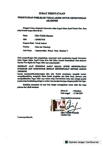 ZIKRI FADLAH HASANIN, - (2025) REDESAIN ALAT PENGUPAS SABUT KELAPA UNTUK MENINGKATKAN EFESIENSI DAN EFEKTIFITAS DENGAN MENGGUNAKAN METODE DESIGN THINKING. Skripsi thesis, Universitas Islam Negeri Sultan Syarif Kasim Riau.