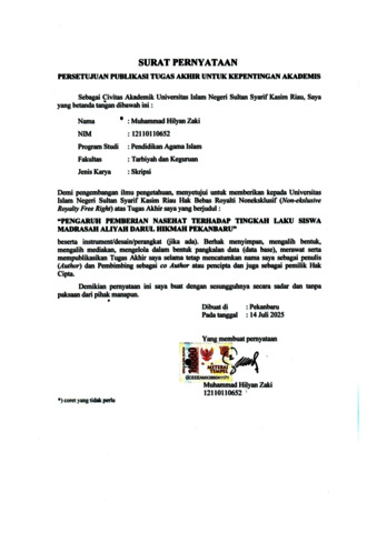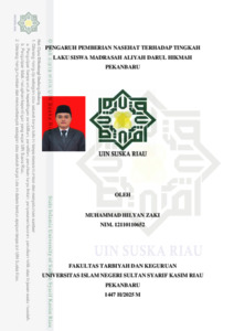ABSTRAK Muhammad Hilyan Zaki (2025) : Pengaruh Pemberian Nasehat terhadap Tingkah Laku Siswa Madrasah Aliyah Darul Hikmah Pekanbaru. Penelitian ini bertujuan untuk menguji pengaruh pemberian nasehat terhadap tingkah laku siswa Madrasah Aliyah Darul Hikmah Pekanbaru. Penelitian ini merupakan jenis penelitian korelasi dengan pendekatan kuantitaif. Populasi pada penelitian ini berjumlah 506 peserta didik. Sampel terdiri dari 75 peserta didik dari seluruh siswa Madrasah Aliyah Darul Hikmah Pekanbaru. Teknik pengumpulan data menggunakan observasi, angket, dan dokumentasi. Teknik analisis data menggunakan regresi linear sederhana. Berdasarkan hasil penelitian diperoleh nilai signifikansi 0,028 < 0,05, maka Ha diterima dan H0 ditolak. Hal ini berarti terdapat pengaruh yang signifikan pemberian nasehat terhadap tingkah laku siswa Madrasah Aliyah Darul Hikmah Pekanbaru. Kata kunci: Pemberian Nasehat, Tingkah Laku