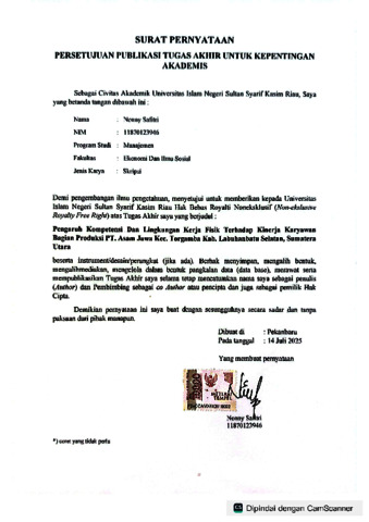 NONNY SAFITRI (2025) PENGARUH KOMPETENSI DAN LINGKUNGAN KERJA FISIK TERHADAP KINERJA KARYAWAN BAGIAN PRODUKSI PT. ASAM JAWA KEC. TORGAMBA KAB. LABUHANBATU SELATAN, SUMATERA UTARA. Skripsi thesis, UNIVERSITAS ISLAM NEGERI SULTAN SYARIF KASIM.