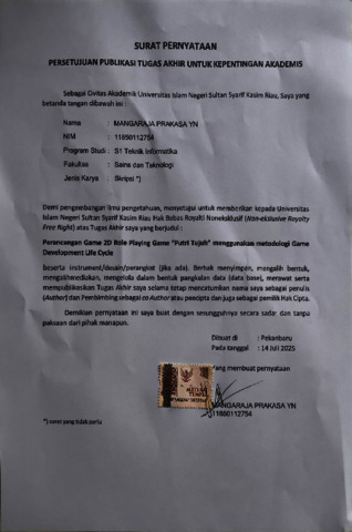 MANGARAJA PRAKASA YN, - (2025) PERANCANGAN GAME 2D ROLE PLAYING GAME “PUTRI TUJUH” MENGGUNAKAN METODOLOGI GAME DEVELOPMENT LIFE CYCLE. Skripsi thesis, UIN SUSKA.