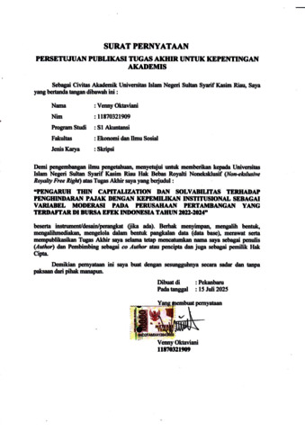 VENNY OKTAVIANI, - (2025) PENGARUH THIN CAPITALIZATION DAN SOLVABILITAS TERHADAP PENGHINDARAN PAJAK DENGAN KEPEMILIKAN INSTITUSIONAL SEBAGAI VARIABEL MODERASI PADA PERUSAHAAN PERTAMBANGAN YANG TERDAFTAR DI BURSA EFEK INDONESIA TAHUN 2022-2024. Skripsi thesis, Universitas Islam Negeri Sultan Syarif Kasim Riau.
