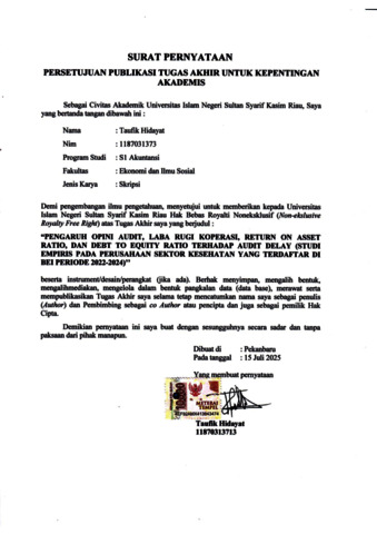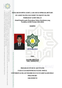 TAUFIK HIDAYAT, - (2025) PENGARUH OPINI AUDIT, LABA RUGI OPERASI, RETURN ON ASSET RATIO, DAN DEBT TO EQUITY RATIO TERHADAP AUDIT DELAY (Studi Empiris pada Perusahaan Sektor Kesehatan yang Terdaftar di BEI Periode 2022-2024). Skripsi thesis, Universitas Islam Negeri Sultan Syarif Kasim Riau.