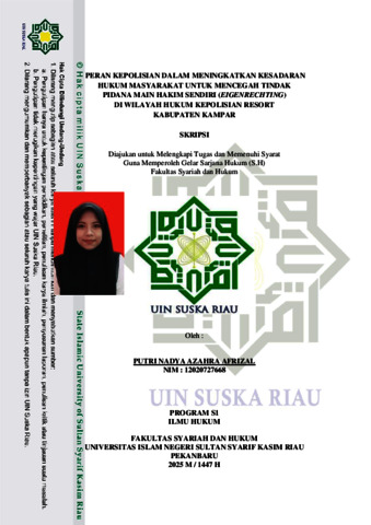 PUTRI NADYA AZAHRA AFRIZAL, - (2025) PERAN KEPOLISIAN DALAM MENINGKATKAN KESADARAN HUKUM MASYARAKAT UNTUK MENCEGAH TINDAK PIDANA MAIN HAKIM SENDIRI (EIGENRECHTING) DI WILAYAH HUKUM KEPOLISIAN RESORT KABUPATEN KAMPAR. Skripsi thesis, UNIVERSITAS ISLAM NEGERI SULTAN SYARIF KASIM RIAU.