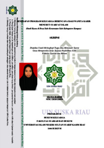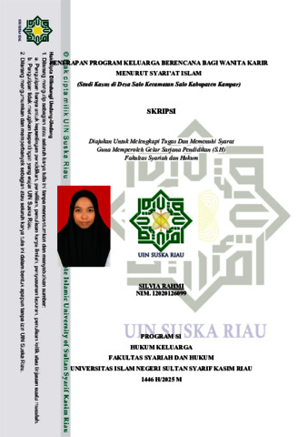 ABSTRAK Silvia Rahmi (2025) : Penerapan Program Keluarga Berencana Bagi Wanita Karir Menurut Syari’at Islam di Desa Salo Kecamatan Salo Kabupaten Kampar Agama Islam sendiri telah mengajarkan pemeluknya untuk tekun bekerja dan beramal shaleh demi kebahagiaan hidup dunia akhiratnya. Wanita sebagai makhluk yang telah Tuhan berikan akal pikiran yang sama dengan pria juga mempunyai naluri yang selalu ingin berusaha meningkatkan kemampuan. Seiring berkembangnya zaman, wanita sebagai ibu sekaligus istri dalam sebuah keluarga, juga telah memutuskan untuk bekerja sebagai bentuk upaya dalam memenuhi kebutuhan hidup. Di desa Salo, terdapat beberapa istri yang memilih untuk menjadi wanita karir (wanita yang bekerja di luar rumah). Disamping itu, para wanita karir yang ada di desa Salo juga memutuskan untuk mengikuti program KB. Mereka menganggap bahwa program KB sangat membantu, agar mereka tetap fokus terhadap pekerjaannya. Tujuan dari penelitian ini adalah Untuk mengetahui mengenai pelaksanaan program Keluarga Berencana yang ada di desa Salo, faktor-faktor yang menyebabkan para wanita karir memilih untuk mengikuti program Keluarga Berencana, serta penerapan program Keluarga Berencana bagi para wanita karir menurut Islam. Penelitian ini merupakan penelitian lapangan (field research) dengan pendekatan kualitatif, Teknik pengumpulan data dengan purposive sampling. Dalam penelitian ini penulis menggunakan analisa data secara deskiptif kualitatif. Sumber primer yang digunakan dalam penelitian ini yaitu: hasil wawancara, observasi, dan dokumentasi. Sedangkan sumber sekunder adalah berupa buku dan hasil penelitan yang relevan. Kemudian sumber tersier berupa kamus. Penelitian ini menunjukkan bahwa wanita karir di Desa Salo memilih mengikuti program Keluarga Berencana (KB) untuk membangun ketahanan finansial, membantu suami mencukupi kebutuhan, fokus pada karir, mengatur jarak kelahiran, dan memberikan masa depan terbaik bagi anak. Dalam Islam, penggunaan KB diperbolehkan untuk mengatur jarak kelahiran dan menjaga kesehatan reproduksi, namun dilarang jika bertujuan menolak anugerah Allah. KB bersifat sementara diperbolehkan selama sesuai syariat, sedangkan KB permanen hanya diperbolehkan dengan alasan medis tertentu. Kata kunci: Keluarga Berencana, Wanita Karir, Islam