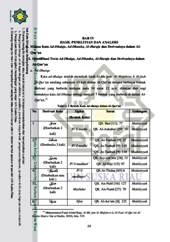 Skripsi ini berjudul tarâduf dalam Al-Qur‘an: analisis makna lafadz ad-dhaiqu, ad-dhanku, dan al-haraju (kajian semantik Al-Qur‘an). Dalam Al-Qur‘an terdapat beragam kata yang memiliki makna sama, dalam bahas Arab studi ini disebut tarâduf. Namun, terdapat kekhususan makna yang membedakan dari setiap kata dan penggunaan kata tersebut dalam Al-Qur‘an. Penelitian ini bertujuan untuk mengkaji makna kata ad-dhaiqu, ad-dhanku, al-haraju dalam Al-Qur‘an menurut pandangan mufassirin dan mengetahui bentuk kekhususan antara ketiga lafadz tersebut. Rumusan masalah yang diangkat dalam penelitian ini adalah bagaimana penafsiran ayat-ayat tentang ad-dhaiqu, ad-dhanku dan al-haraju dalam AlQur‘an menurut pandangan mufassirin dan apa saja bentuk kekhususan makna kata ad-dhaiqu, ad-dhanku dan al-haraju dalam Al-Qur‘an. Penelitian ini menggunakan jenis penelitian kepustakaan (library reserch) yang bersifat kualitatif dengan pendekatan penelitian semantik dan menggunakan metode penafsiran tematik. Hasil penelitian ini menunjukkan bahwa kata ad-dhaiqu, addhanku dan al-haraju merujuk pada makna yang sama yaitu, sempit. Ketiga kata tersebut dalam konteks Al-Qur‘an, memiliki kekhususan makna yang membedakan satu sama lain. Ad-dhaiqu bermakna sempit yang dirasakan dalam dada sehingga terasa khawatir, sedih, cemas serta larangan bersedih dan gelisah, ad-dhanku mengarah pada sempit dalam kehidupan didunia berupa kesusahan dan al-haraju diartikan keresahan dan kekosongan jiwa karena perbuatan dosa dan haram, serta larangan berat hati dan penafian terhadap kesulitan dan keberatan. Kata Kunci : Târaduf, Al-Qur‟an, Ad-dhaiqu, Ad-dhanku, Al-Haraju