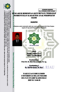 Skripsi dengan judul "Pengaruh Hereditas (Keturunan) Terhadap Pembentukan Karakter Anak Perspektif Hadis" Ini ditulis oleh Indra Hidayat, NIM. 12130410810. Penelitian ini membahas hadis-hadis yang berkaitan dengan hereditas terhadap pembentukan karakter anak serta mengkaji pengaruh hereditas terhadap pembentukan karakter menurut hadis. Latar belakang penelitian ini didasari oleh sebuah pribahasa yang sudah familiyar dimasyarakat yaitu “Buah tidak akan jatuh jauh dari Pohonnya” yang artinya karakter atau sikap dan sifat seorang anak tidak akan beda jauh dari orangtuanya. Rumusan masalah dalam penelitian ini mencakup: “bagaimana hadis-hadis Nabi SAW yang berkaitan dengan hereditas terhadap pembentukan karakter anak dan bagaimana pengaruh hereditas dalam pembentukan karakter anak Pespektif Hadis”. Penelitian ini menggunakan pendekatan kualitatif dengan metode studi pustaka (library research), yang mengkaji hadis-hadis yang ditemukan dalam Kutub as-sittah dan literatur Islam lainnya. Hasil penelitian menunjukkan bahwa hereditas berpengaruh terhadap pembentukan karakter anak, salahsatunya hadis tentang anjuran memilih tempat benih yang baik untuk keturunan (“Pandai-pandailah Memilih Benih Untuk Tempat Sperma Kalian, nikahilah Wanita yang setara dan nikahkanlah mereka”). Hadis ini berkualitas hasan lighairihi, dengan sanad yang lemah namun diperkuat dengan makna dari riwayat lain. Hereditas memegang peranan penting dalam pembentukan karakter anak, salahsatunya aspek psikologis seperti sifat, intelegensi, dan bakat yang diturunkan dari orang tua dan leluhur. Nabi Muhammad SAW menekankan pentingnya memilih tempat benih yang baik agar menghasilkan keturunan yang berakhlak mulia. Oleh karna itu pendidikan berperan melenturkan sifat bawaan agar anak tumbuh menjadi pribadi yang baik. Kata Kunci: Hereditas, karakter, hadis.