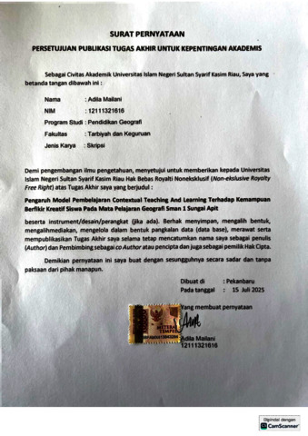 ADILA MAILANI (2025) Pengaruh Model pembelajaran Contextual Teaching and Learning terhadap Kemampuan Berpikir Kreatif Siswa di SMAN 1 Sungai Apit. Skripsi thesis, UNIVERSITAS ISLAM NEGERI SULTAN SYARIF KASIM.