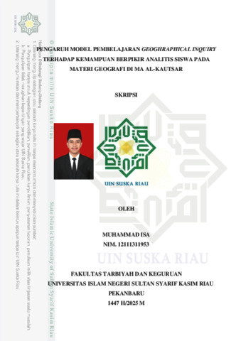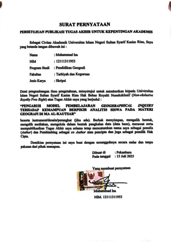 ABSTRAK Muhammad Isa, (2025) : Pengaruh Model Pembelajaran Geoghraphical Inquiry terhadap Kemampuan Berpikir Analitis Siswa pada Materi Geografi di MA Al-Kautsar Penelitian ini bertujuan untuk menganalisis pengaruh penggunaan model pembelajran Geoghraphical Inquiry terhadap kemampuan berpikir analitis siswa pada materi hidrosfer di kelas X MA Al-Kautsar. Penelitian ini menggunakan pendekatan kuantitatif dengan metode quasi eksperimen desain non equivalent control grup design. Populasi dalam penelitian ini adalah seluruh siswa kelas X yang terdiri dari empat kelas. Penarikan sampel ditentukan dengan teknik purposive sampling dimana siswa kelas X-A untuk kelas eksperimen dengan perlakuan menggunakan model pembelajaran Geoghraphical Inquiry dan siswa kelas X-B untuk kelas kontrol dengan menggunakan model pembelajaran konvensional. Pengumpulan data dilakukan dengan pretest dan posttest berupa soal essay, lembar observasi, dan dilengkapi dengan dokumentasi. Analisis data penelitian menggunakan statistik parametrik dengan uji beda (uji t) dan uji N-Gain. Hasil penelitian menunjukkan bahwa penggunaan model pembelajaran Geoghraphical Inquiry pada kelas eksperimen memberikan pengaruh yang signifikan terhadap kemampuan berpikir analitis siswa pada materi hidrosfer. Hal ini dibuktikan dengan uji independent sample test kelas eksperimen dan kontrol, tidak ada perbedaan saat pretest (t-hitung ≤ t-tabel /0,432 ≤ 2,0117), dan ada perbedaan signifikan pada posttest (t-hitung ≥ t-tabel /4,929 ≥ 2,0117). Berdasarkan uji paired sample test, baik di kelas eksperimen maupun di kelas kontrol terdapat perbedaan nilai antara pretest dan postest (t-hitung ≤ t-tabel 19,762 ≤ 2,0117 pada kelas eksperimen dan 7,359 ≤ 2,0117 pada kelas kontrol) yang menunjukkan bahwa kedua perlakuaan berpengaruh signifikan terhadap kemampuan berpikir analitis. Namun, pengaruh yang lebih besar ditunjukkan pada kelas eksperimen dengan rata rata N-Gain skor 69,34 (kategori sedang), dibandingkan rata-rata N-Gain skor kelas kontrol sebesar 17,04 (kategori rendah). Kata Kunci: Geoghraphicai Inquiry, Kemampuan Berpikir analitis, Hidrosfer