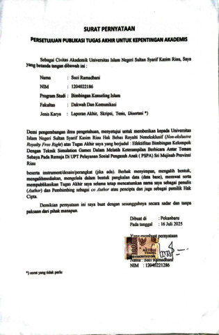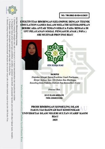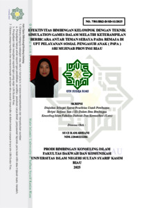 SUCI RAMADHANI, - (2025) EFEKTIVITAS BIMBINGAN KELOMPOK DENGAN TEKNIK SIMULATION GAMES DALAM MELATIH KETERAMPILAN BERBICARA ANTAR TEMAN SEBAYA PADA REMAJA DI UPT PELAYANAN SOSIAL PENGASUH ANAK ( PSPA ) SRI MUJINAB PROVINSI RIAU. Skripsi thesis, UNIVERSITAS ISLAM NEGERI SULTAN SYARIF KASIM RIAU.