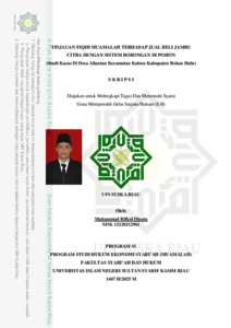 ABSTRAK Muhammad Rifkal Dinata (2025) : Tinjauan Fiqih Muamalah Terhadap Jual Beli Jambu Citra Dengan Sistem Borongan Di Pohon (Studi Kasus Di Desa Aliantan, Kecamatan Kabun, Kabupaten Rokan Hulu) Skripsi ini membahas tentang praktik jual beli jambu citra dengan sistem borongan di pohon di Desa Aliantan, Kecamatan Kabun, Kabupaten Rokan Hulu. Penelitian ini dilatarbelakangi oleh praktik jual beli jambu citra dengan sistem borongan di pohon di Desa Aliantan yang banyak dilakukan tetapi belum memenuhi rukun dan syarat jual beli. Rumusan masalah pada penelitian ini menanyakan bagaimana proses jual beli jambu citra dengan sistem borongan di pohon, di Desa Aliantan, Kecamatan Kabun, Kabupaten Rokan Hulu? bagaimana tinjauan fiqih muamalah terhadap jual beli jambu citra dengan sistem borongan di pohon, di Desa Aliantan, Kecamatan Kabun, Kabupaten Rokan Hulu? . Sebelas informan berpartisipasi dalam dalam studi lapangan ini, yaitu lima informan kunci yaitu pemilik pohon atau penjual, lima informan utama yaitu para pemborong dan satu informan pendukung yaitu Bapak Marisal selaku kepala desa Aliantan, Kecamatan Kabun, Kabupaten Rokan Hulu. Analisis yang dipakai ialah deskriptif kualitatif yaitu metode yang menggambarkan tentang bagaimana pendokumentasian fakta di lapangan dengan menggunakan pengamatan penulis sendiri baik itu melalui penglihatan dan pendengaran. Hasil yang didapati dari penelitian ini adalah praktek jual beli jambu citra dengan sistem borongan di pohon belum sepenuhnya sesuai dengan rukun dan syarat sahnya jual beli, dan bertentangan dengan ketentuan syara‟, di dalam pelaksanaan pengambilan barangnya ada kejanggalan, dan kejanggalan tersebut menjadikan bahwa jual beli itu tidak sah. Hal ini dikarenakan kualitas dan kuantitas barang sudah berbeda pada saat sesudah dibeli. Sebagian ulama berpendapat bahwa apabila sifat-sifat barang tersebut tidak diketahui dengan jelas maka jual beli itu tidak sah (batal). Maka bisa dikatakan bahwa jual beli jambu citra dengan sistem borongan di pohon yang ada di Desa Aliantan, Kecamatan Kabun, Kabupaten Rokan Hulu adalah tidak sah. Kata kunci: Fiqih Muamalah, Jual Beli, Borongan