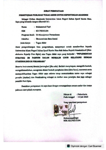 MUHAMMAD FAJRI, - (2025) IMPLEMENTASI STRATEGI IM PARFUM DALAM MENJALIN GOOD RELATIONS DENGAN STAKEHOLDER DI PEKANBARU. Laporan thesis, UNIVERSITAS ISLAM NEGERI SULTAN SYARIF KASIM RIAU.